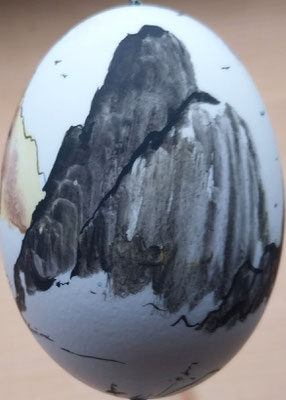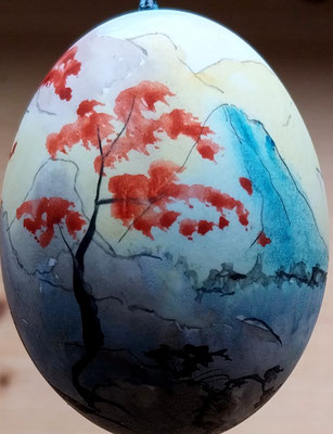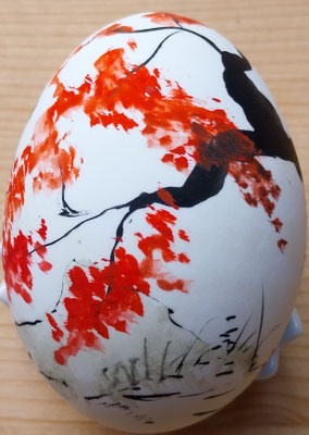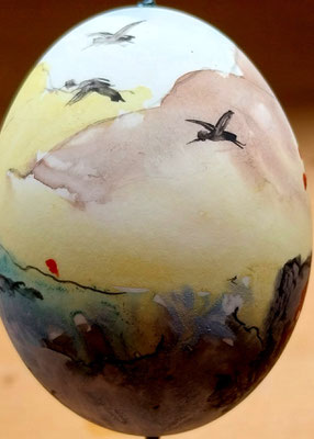 Fasanen, die mit Tempera- Farbe freihändig, ohne Schablone bemalt und mit Lack überzogen werden. Jedes Ei ist aufgrund seiner Form und Farbgebung ein absolutes Unikat. Die Aufhängung wird auf die